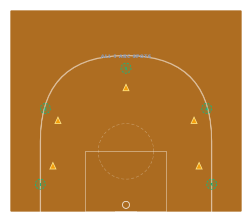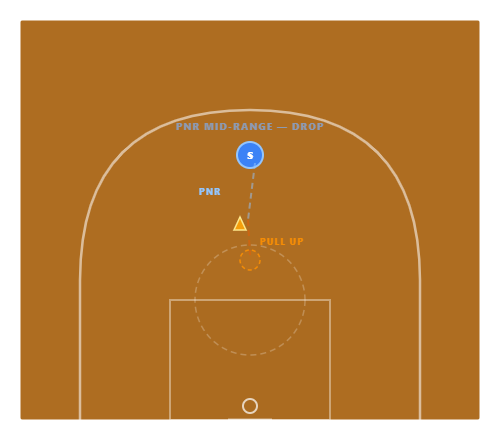 vs. Drop Coverage: A cone simulates the screener at the elbow. Dribble off the “screen” and attack. The defense “drops” — the big man sags into the paint. You pull up in the open space at the free-throw line. This is the most common PnR mid-range: the big man gives you space, you take the 15-footer. 10 makes from the right and left side.