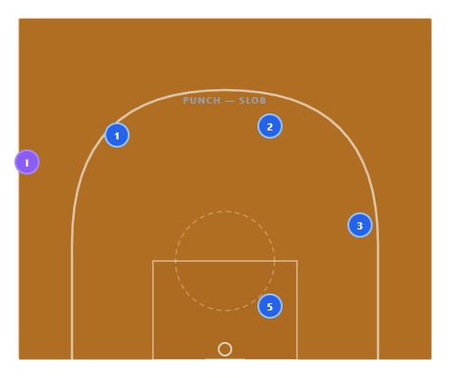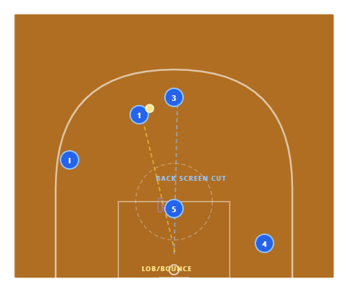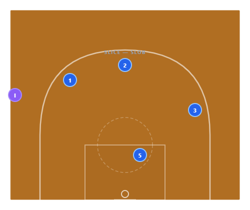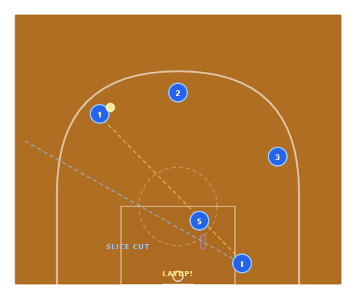 The Slice : The inbounder cuts baseline, using 5’s screen at the elbow. They “slice” across the lane and pop out on the far block. 1 hits the slicer with a bounce pass for a layup. The defense loses track of the passer — and the screen from 5 catches any recovery attempt.