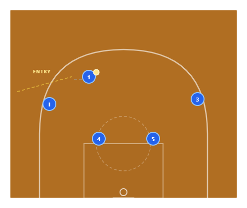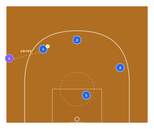 Draw the Defense : The inbounder passes to 3 on the ball-side wing. The defense shifts toward the ball — help defenders cheat toward 3. Meanwhile, 4 quietly relocates to the weak-side corner. The entire defense is now watching the ball on the left side.
