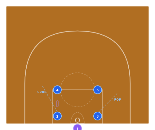 Floppy Setup: 2 and 3 start on the blocks. 4 and 5 are at the elbows. Each shooter (2 and 3) will read their defender and choose which screen to use — curl around the elbow screen (tight) or fade to the corner off the block screen (wide).