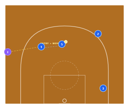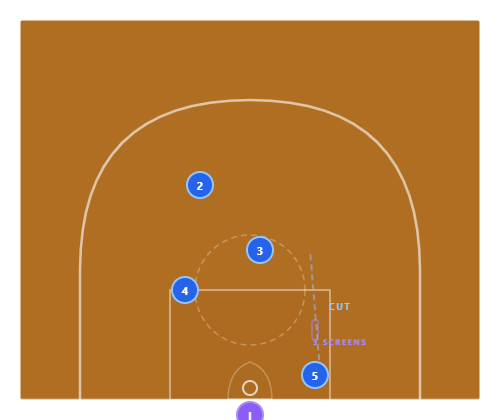 Baseline Double Screen : 5 and 4 set a staggered double screen across the baseline. 3 runs the baseline, using both screens. The first screen (5) rubs off 3’s defender. The second screen (4) catches any switch or recovery attempt. By the time 3 reaches the corner, they’re wide open.
