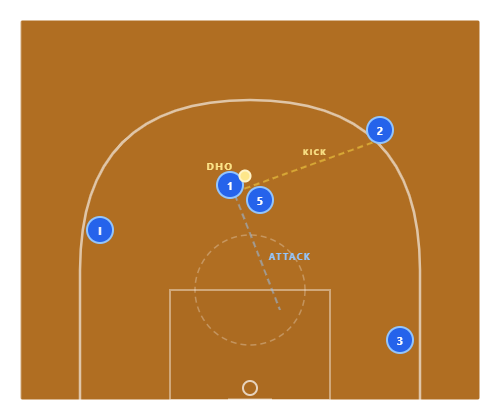 Best when 1 is a dynamic guard who can attack off the handoff. The DHO gives them a running start with a screener rolling — a guard's dream scenario.